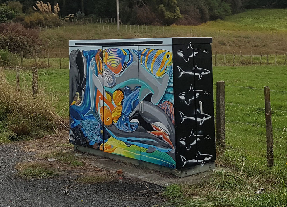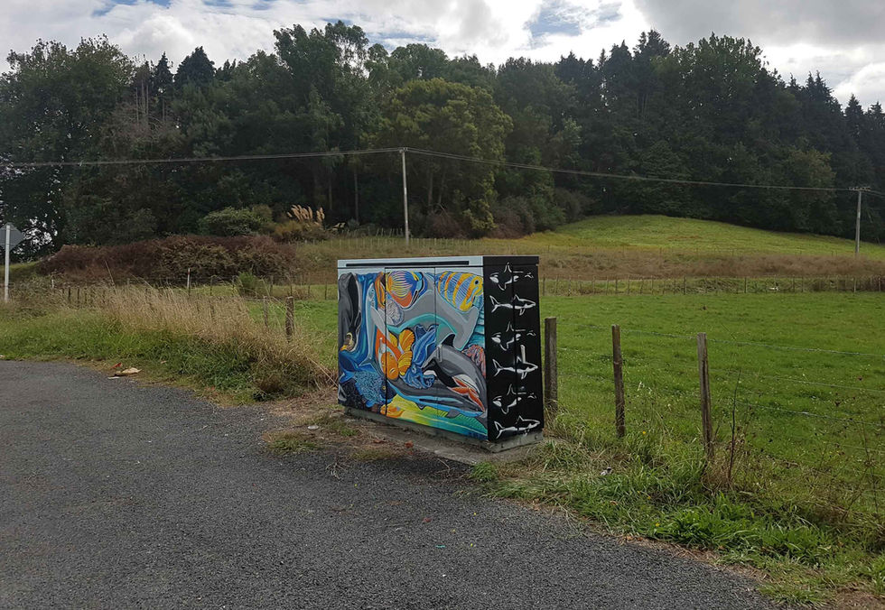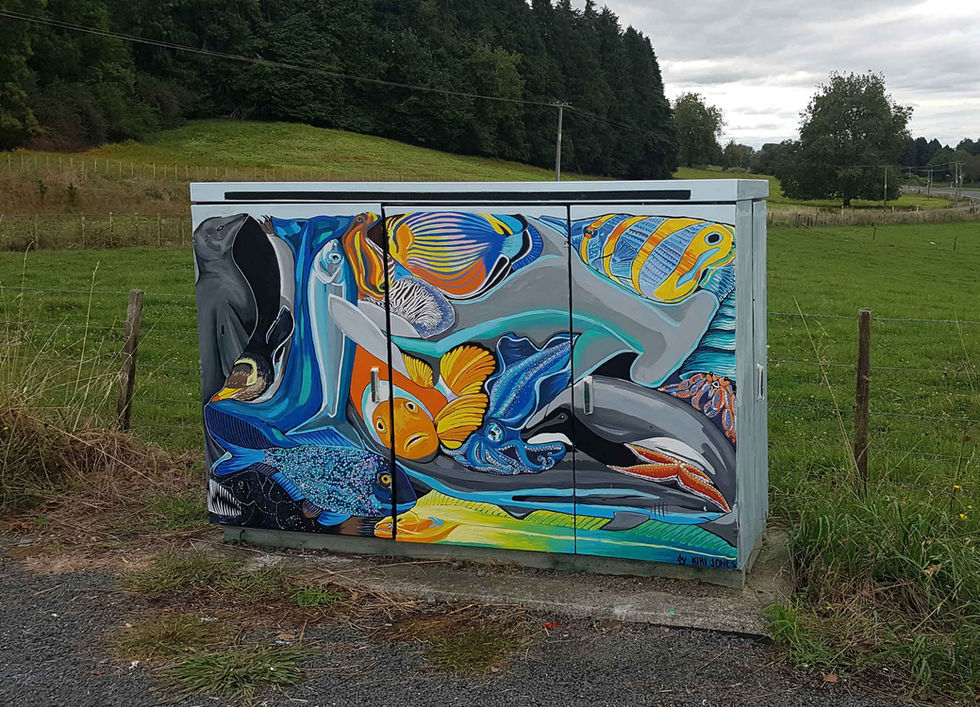 Chorus & Keep NZ Beautiful commission local artists to paint murals on their chorus cabinets to prevent vandalism. This is my mural on Puahue Road, Te Awamutu, NZ.